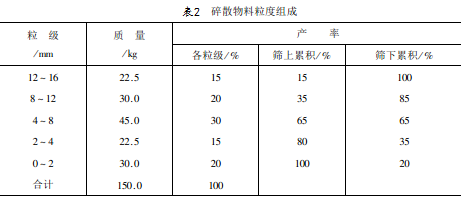 試驗結(jié)果處理的基本內(nèi)容是計算產(chǎn)率。產(chǎn)率分為粒級產(chǎn)率與累積產(chǎn)率,粒級產(chǎn)率是該粒級的質(zhì)量占被篩物料總質(zhì)量的百分率,累積產(chǎn)率又分為篩上累積產(chǎn)率(又叫正累積)及篩下累積產(chǎn)率(又叫負(fù)累積)。正累積產(chǎn)率是大于某一篩孔的各粒級產(chǎn)率之和,負(fù)累積產(chǎn)率是小于某一篩孔的各粒級產(chǎn)率之和。在計算粒級產(chǎn)率時,“被篩物料總質(zhì)量”可以用各粒級質(zhì)量之和,也可以用原試樣的質(zhì)量,此時把損失量加入較細(xì)級別,認(rèn)為篩分時呈灰塵飛揚了?;镜暮Y分試驗記錄及結(jié)果處理如表2所示。